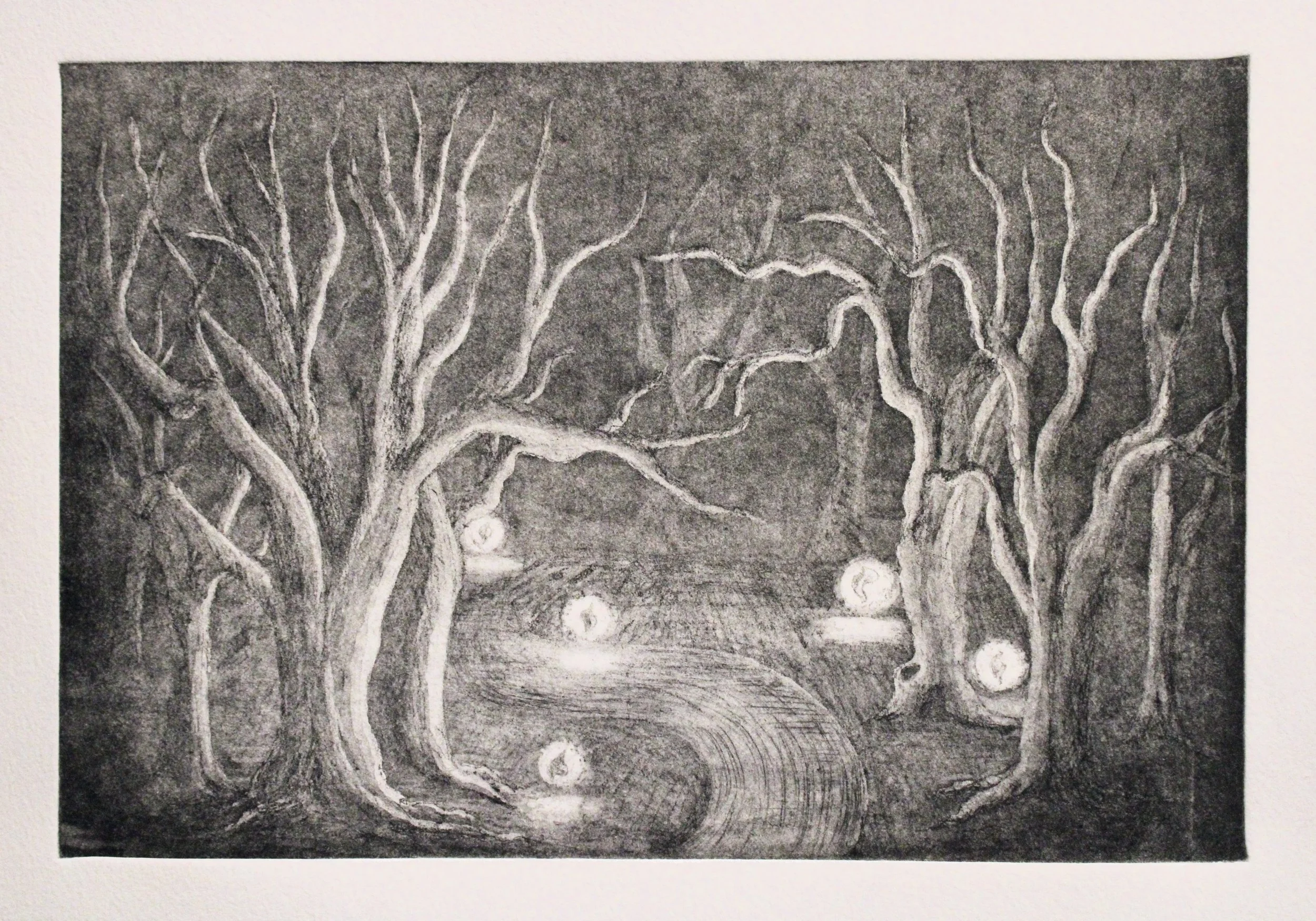 "Where Death Spreads Jealous Wings," stone lithograph and watercolor, 9"x12", 2024.